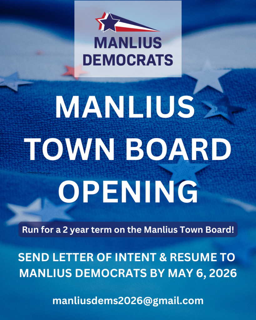 There is a vacancy on the Manlius Town Board. To be on the ballot this November to fill this vacancy, please send a letter of intent and resume to our Chair, Dylan Black at manliusdems2026@gmail.com. If you have any questions or would like a list of committee members, please contact Dylan.